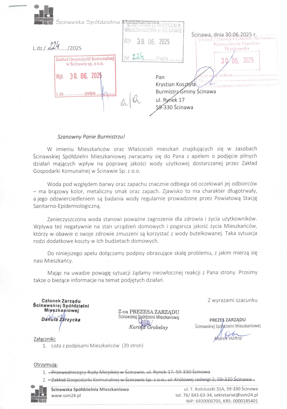 skierowany został apel z wnioskiem o podjęcie pilnych działań mających wpływ na poprawę jakości wody użytkowej dostarczanej przez przedsiębiorstwo wodno-kanalizacyjne.